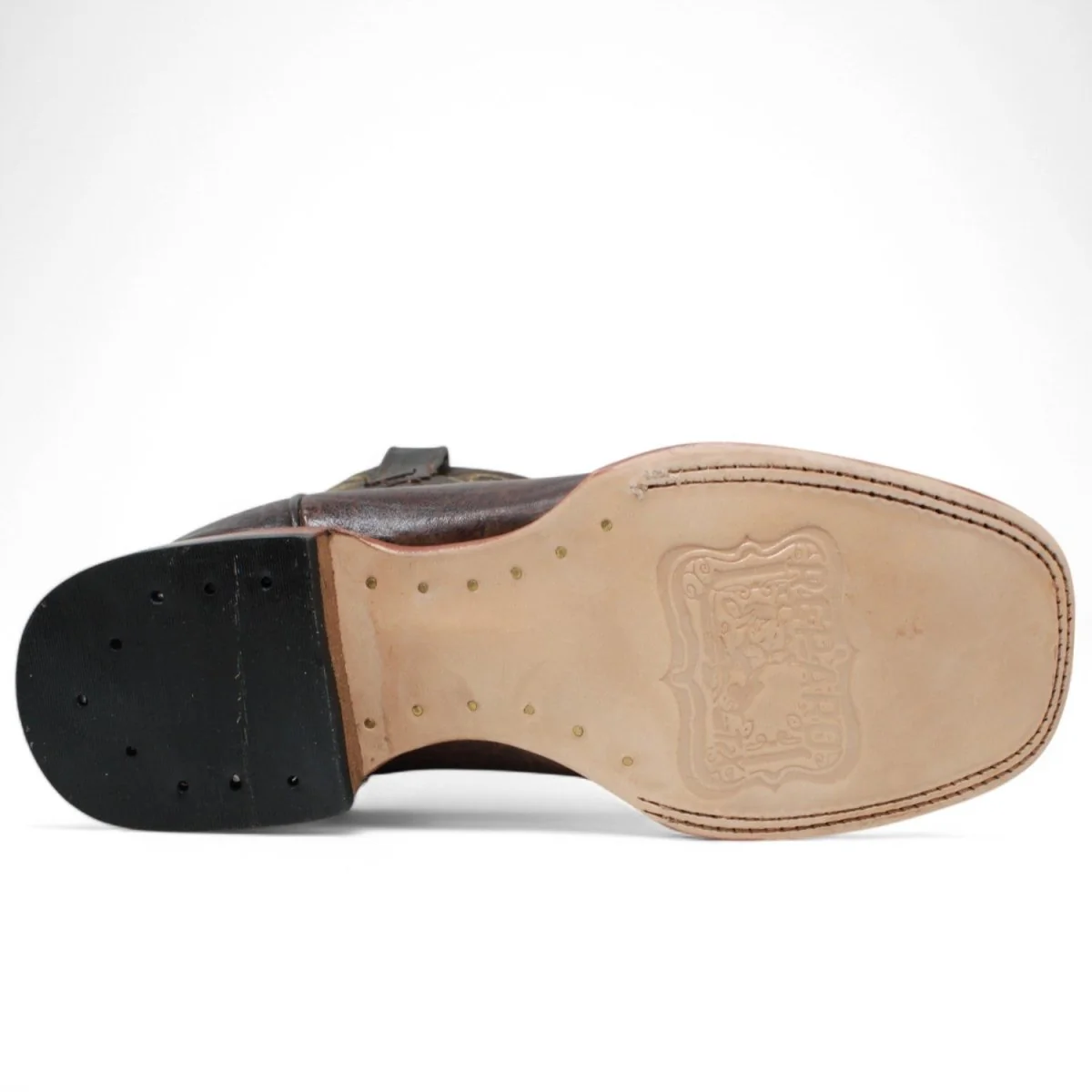 Handmade men’s western boots in brown Bull Shoulder vamp. Designed with a 12″ brown shaft, wide square toe, stockman heel, and leather outsole. Features pull tabs, cushioned comfort insole, leather lining, and western stitching. Brand craftsmanship proudly made in Mexico.