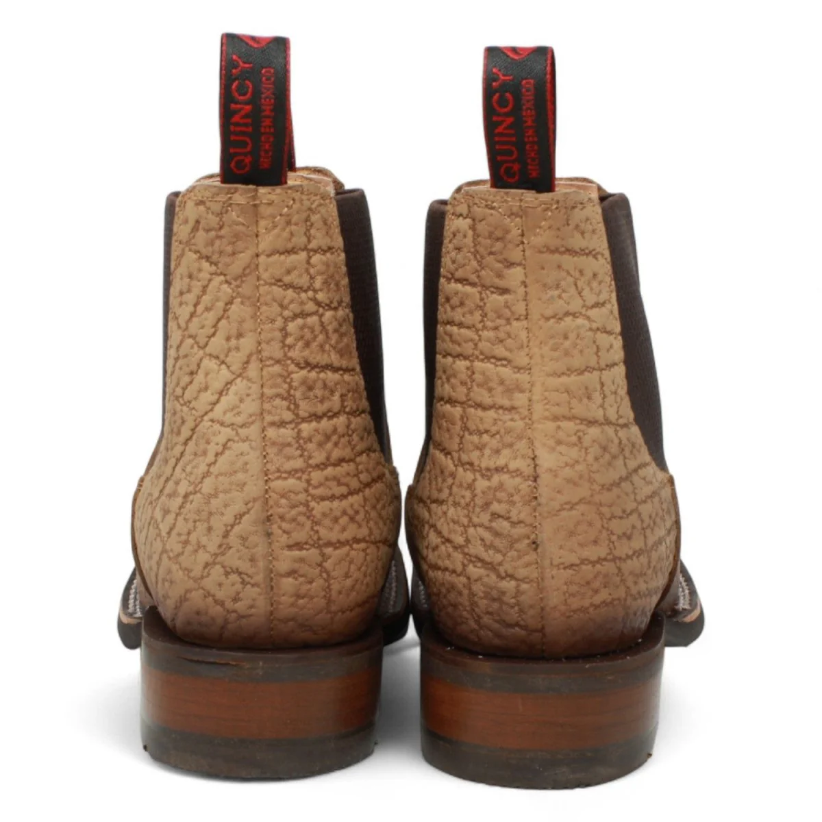 Botines Quincy Boots modelo Q82BU7051, hechos a mano en fina piel de cuero grabado elefante en color negro. Confeccionados en horma de punta cuadrada, ancho EE para mayor comodidad y suela de hule antiderrapante que brinda seguridad y estabilidad en cada paso.