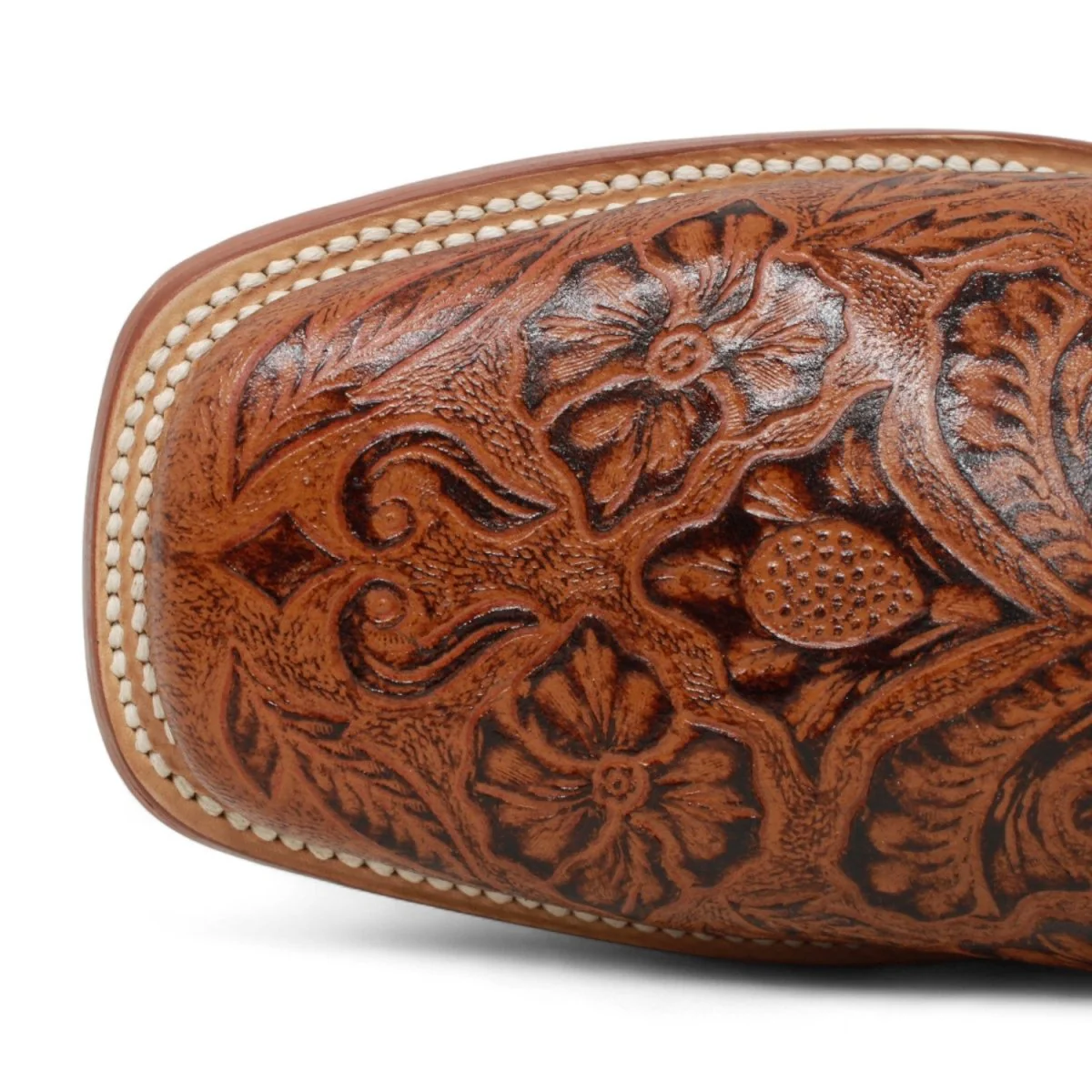 Botas Tanner Mark Boots confeccionadas a mano en fina piel de cuero cincelado grabado en color Cognac. Diseñadas con horma de punta cuadrada, tacón de 1.5 pulgadas y suela de cuero resistente, brindan autenticidad, durabilidad y estilo vaquero clásico.