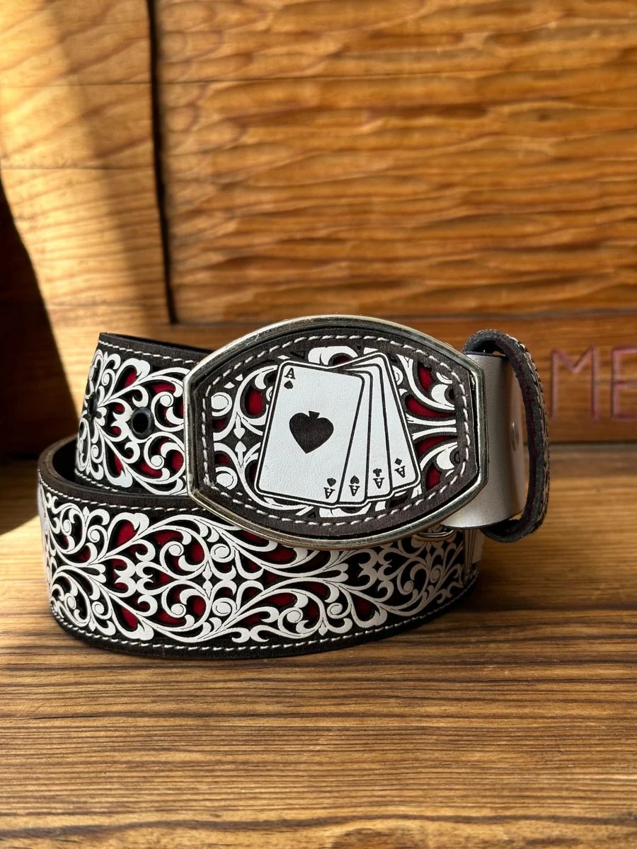 El cinturón vaquero de Pokar de Ases es una elección impresionante para los amantes de lo vaquero. Hecho con piel de res color blanco y negro y con corte láser, este cinturón es resistente y duradero. El diseño impreso con tinta en color blanco con fondo rojo lo hace lucir único y extravagante. Con un ancho de 2 pulgadas y un espesor de 1/4, es el complemento perfecto para cualquier atuendo de vaquero. Es uno de los cinturones más vendidos en nuestra tienda en línea, una excelente opción para cualquier ocasión especial o para un día casual en el trabajo.