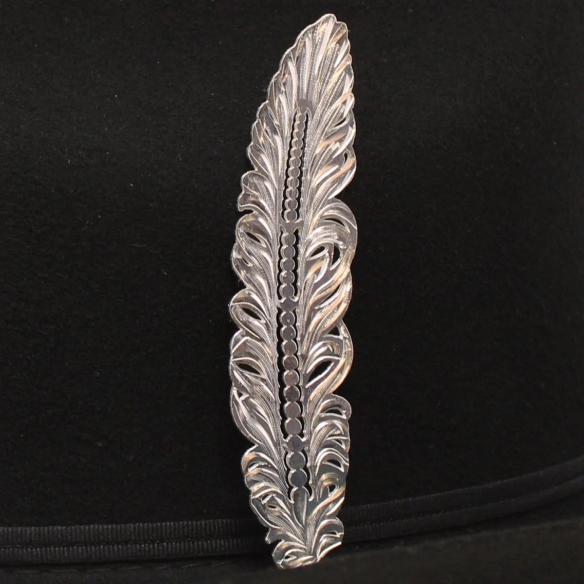 Stick a Feather in your hat! completely innovative Hat Feather that with a little twist and flip will secure onto your hat band. Feathers are such a beautiful accent in any form to wear and this hat feather is no exception. Finished in a bright silver this feather was engraved to mimic the beauty and irregularity of a natural feather, with sections and little swirls that add character and interest for this piece. This classic hat feather is hand-painted a deep black down the main vane highlighting the line of microbeads down the shaft. The trademarked fastening system will secure onto most hat bands.