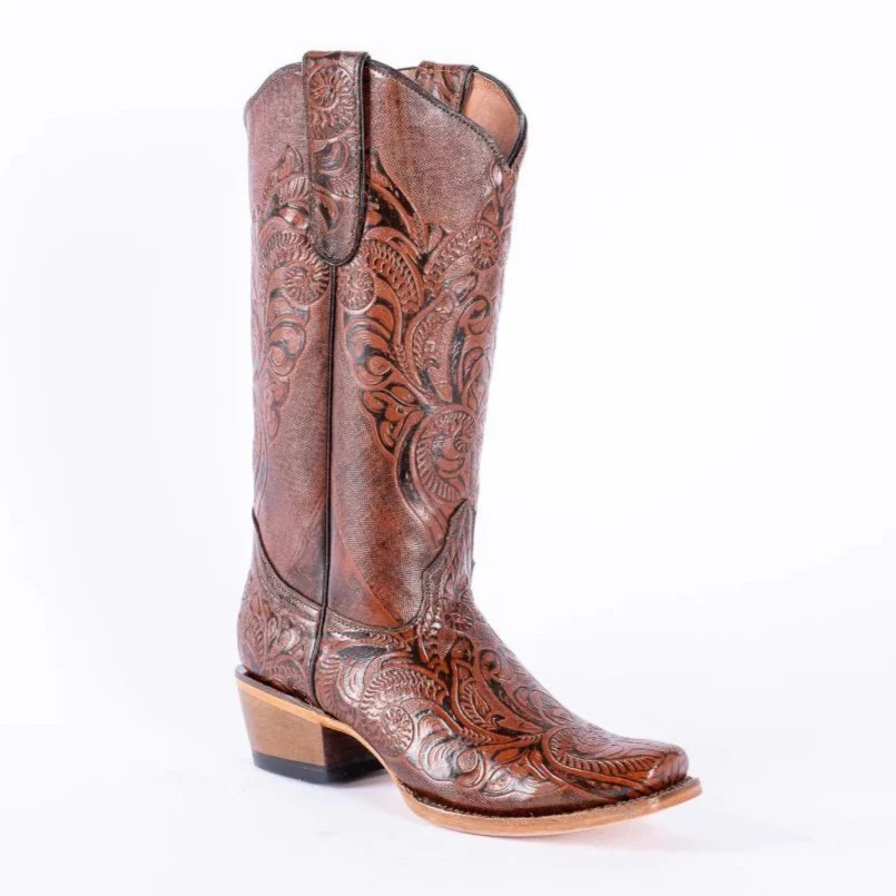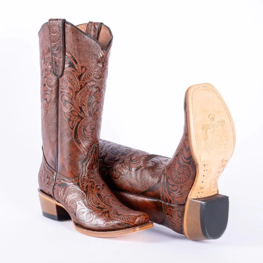 Tanner Mark Women’s Hand Tooled Square Toe Leather Boots Cognac
